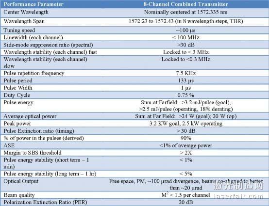 表中概述了激光發(fā)射器的光學(xué)性能要求,這些要求來源于二氧化碳測量和儀器結(jié)構(gòu)的科學(xué)目標(biāo),決定采用主振蕩器功率放大器(MOPA)激光構(gòu)架是因為復(fù)雜的頻譜要求,決定采用摻鉺光纖放大器(EDFA)實現(xiàn)功率放大是因為技術(shù)成熟度和之前的性能驗證。