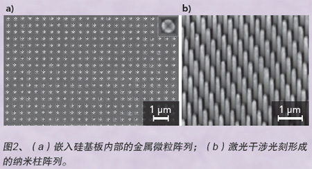 激光干涉光刻(Laser Interference Lithography, LIL)是在短時(shí)間內(nèi)形成大面積周期納米結(jié)構(gòu)(例如納米點(diǎn)或納米線陣列)的一種功能強(qiáng)大的工具。只需暴露紫外線幾分鐘,然后采用光致抗蝕刻和化學(xué)蝕刻或者剝離工藝,即能夠在金屬薄膜上形成等離子體納米結(jié)構(gòu)。激光光束的相干長度是大面積(厘米級)兩次光束干涉的一個(gè)關(guān)鍵因素。一次激光輻照形成納米線性陣列,將樣品旋轉(zhuǎn)90°之后,另一次激光輻照用于形成納米點(diǎn)陣列。通過控制輻照時(shí)間和輻照方案,能夠形成各種納米結(jié)構(gòu),形狀范圍從矩形到三角形和橢圓形。通過化學(xué)腐蝕也可以將光致抗蝕刻層形成的2D納米結(jié)構(gòu)傳輸?shù)交澹孕纬?.5D納米結(jié)構(gòu)。圖2(a)顯示了嵌入硅基板內(nèi)部的金屬納米點(diǎn)陣列,圖2(b)顯示了LIL形成的納米柱陣列。