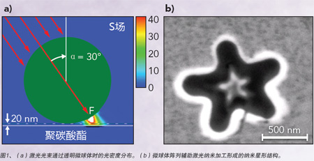 激光納米加工的關(guān)鍵挑戰(zhàn)是如何將空氣中的紫外線或可見激光光束聚焦到亞100nm,從而克服光學(xué)衍射限制。我們的研究顯示,自排列或大面積旋轉(zhuǎn)涂抹形成的透明微球體陣列能夠?qū)⑷肷浼す夤馐蛛x為成千上百萬的微小光束,還能用作透鏡,聚焦這些微小光束以開展表面納米制圖。如圖1(a)所示,局部光線密度大幅增強(qiáng),并以平行模式加工樣品。這種技術(shù)采用通常的二維(2D)微球體陣列將入射激光光束聚焦到基板,因此,只需幾次激光輻射脈沖,即能夠采用單步表面制圖方法在基板上產(chǎn)生成千上百萬的亞微米孔洞。激光納米加工之后,采用傳統(tǒng)超聲波清潔可以清除微球體。靈活控制激光光束掃描外形,可以形成復(fù)雜的納米結(jié)構(gòu)設(shè)計(jì),例如圖1(b)所示的星形陣列。