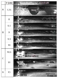 對于全熔透焊接,焊接參數對焊縫質量的影響非常大。圖 2 中顯示了激光功率參數對焊縫質量的影響。從圖中可以看到,當激光功率從 7.75 kW 增加到 13 kW 時對焊縫質量的影響。該試驗是在厚度為 12 mm 的低碳鋼 S235 上進行的,焊接速 度恒定為 1 m/min。當激光功率為 7.75 kW 時,我們可以看到熔池的影響。在進料的反方向上,處于熔化節(jié)點和激光束出現點之間存在一個幾毫米的缺口。當激光功率 為 8 kW 時,熔池移動到了激光束出現之前,從而出現 微小熔化增多,避免了熔滴。進一步增加激光功率,會導致熔化節(jié)點和激光束出現點之間更大的差 距。當功率為 10 kW 時, 能獲得1.1 mm 的最大熔深。熔池動態(tài)受到了影響,并且 在底部可以檢測到一 個旋轉的熔體流動。