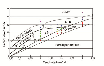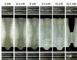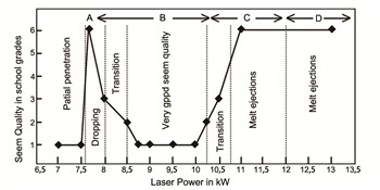 當焊接進給速度進一步增至 8 m/min時,位于毛細管的尾部,在焊接進給速度(沒有任何輔助切割氣體)。這種效應被稱為蒸汽壓力熔切(VPMC)。圖 2b 中分別顯示了工件頂部、底部以及截面的焊縫質量。若將焊縫質量的等級以數字區(qū)分,1代表質量非常好,而6代表質量很差。我們可以看到,對于 12mm 厚的低碳鋼來說,在激光功率為 8.7~10 kW 之間時, 可以實現深熔焊并獲得良好的焊接效果。在實際工業(yè)應 用中,我們建議的選擇功率為 9.25 kW(即大約處于功率 中點),以便增加激光加工過程的可靠性。正如上文提及, 該試驗是在進給速度為 1m/min 的情況下進行的。