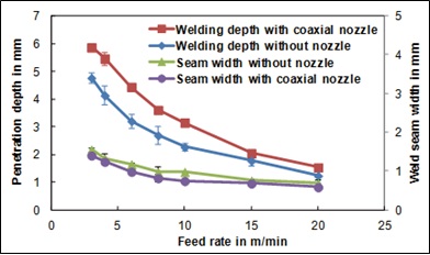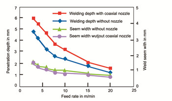 9使用和不使用同軸噴嘴情況下的穿透深度和焊縫跨度。