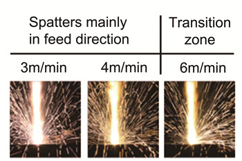 當焊接速度為 v = 3~4 m/min 的中等速度時,飛濺物 將從前部、后部以及各個方向上的毛細管側壁噴出,尤其 在焊接方向上會有增加(見圖 4)??傊@些飛濺物很小,不會粘到工件表面。但是有一些大的飛濺物會污染到工件表面。盡管如此,其焊縫質量仍然非常好,焊接強度很大。