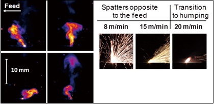 隨著進給速度的增加,毛細管前 部變得越來越平坦。當進給速度增加 至 6 m/min,焊縫熔池表現出很高的動態(tài)性。結果顯示,在毛細管孔徑背 后的焊縫熔池開始膨脹,變得更加動 蕩不安。一個有點不均勻的上珠出現。在這個焊接給進速度下,形成了一個 介于高速和低速焊接的過渡區(qū)。
