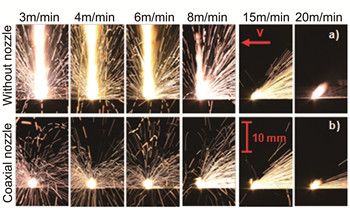 圖7在不同的進給速率下,使用和不使用同軸噴嘴情況下的側面圖。