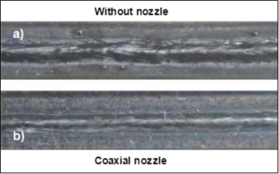 8不使用同軸噴嘴(a)和使用同軸噴嘴(b)時,頂部的焊縫質量。