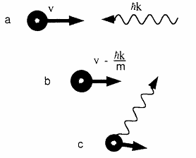 圖1、左圖演示了速度為v的原子與動(dòng)量為hk的光子相遇后,吸收光子后速度減小了hk/m,然后各向同性釋放光子后原子的總速度比最初降低了。右圖是實(shí)驗(yàn)室拍到的三對(duì)激光形成的光學(xué)糖漿。