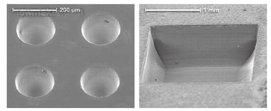 圖2:超快脈沖實(shí)現(xiàn)玻璃的精細(xì)加工。a)利用10μJ的355nm脈沖在玻璃上鉆出的440μm孔;b)利用355nm脈沖在Pyrex玻璃上銑出2mm的正方形區(qū)域。