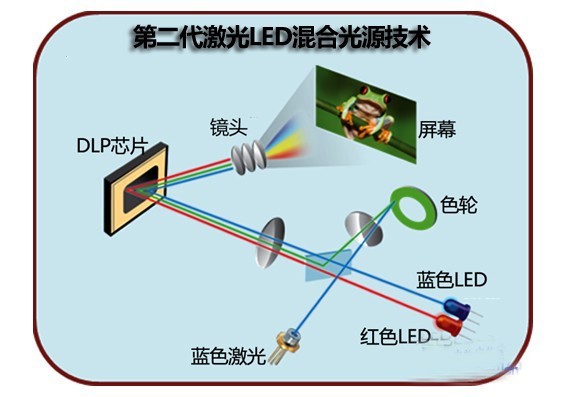 激光+LED混合光源技術(shù)是將紅(高亮度紅色LED)、綠(藍色激光通過熒光體轉(zhuǎn)換為綠色)、藍(藍色激光)三色,通過DLP芯片投影,即可以不使用高壓水銀燈泡而實現(xiàn)高亮度投影。激光+LED新光源集合這兩種光源壽命長、色域廣的特點于一身,在長時間內(nèi)亮度衰減不明顯,能較長時間保持鮮艷的影像品質(zhì),減少了維護成本和使用成本,現(xiàn)階段主要應(yīng)用在商務(wù)和教育領(lǐng)域。就現(xiàn)階段而言,三基色純激光、熒光粉+藍光、LED+激光三項激光顯示技術(shù)將會共存一段時間。