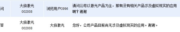 周三大族激光(26.50, 0.45, 1.73%)(002008)表示,公司產(chǎn)品目前尚無(wú)涉及虛擬現(xiàn)實(shí)的應(yīng)用。 大族激光主營(yíng)業(yè)務(wù)為激光加工,PCB,