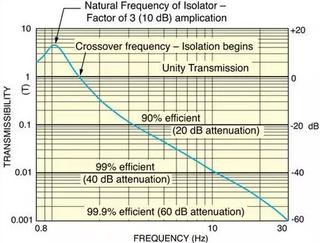 曲線從(0Hz,0dB)原點(diǎn)開(kāi)始。當(dāng)頻率很低時(shí),桌腿本質(zhì)上是剛體,任何振動(dòng)都會(huì)被傳遞到桌面。之后曲線上升,在1-2Hz時(shí)達(dá)到峰值。此即桌腿的固有共振(Natural Frequency)和最大放大倍數(shù)。圖中任何一處曲線高于1(Unity Transmission)時(shí),桌腿都將放大振動(dòng)。輕阻尼(Lightly Damped)隔振腿對(duì)應(yīng)高而尖的峰,而重阻尼(Heavily Damped)隔振腿對(duì)應(yīng)低而平滑的峰。大多數(shù)桌腿在固有共振頻率處都放大3到4倍振動(dòng)。當(dāng)頻率增大并超過(guò)桌腿共振頻率后,曲線迅速下降,振動(dòng)傳遞率降到1以下后桌腿開(kāi)始“隔振”。開(kāi)始隔振時(shí)的頻率(Crossover Frequency)約為固有共振頻率的1.4倍。隨著曲線下降,機(jī)械高通濾波愈加有效。大部分桌腿在10Hz時(shí)可過(guò)濾超過(guò)90%的地面振動(dòng),100Hz時(shí)可過(guò)濾99%的振動(dòng)。