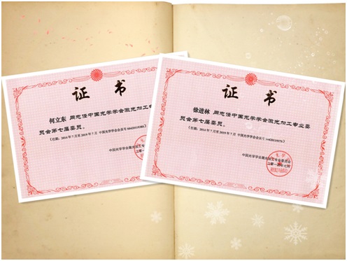 2016年1月,武漢華日精密激光有限公司總經(jīng)理何立東和技術(shù)總監(jiān)徐進(jìn)林正式獲得由中國(guó)光學(xué)學(xué)會(huì)激光加工專業(yè)委員會(huì)頒發(fā)的第七屆委員會(huì)委員證書。