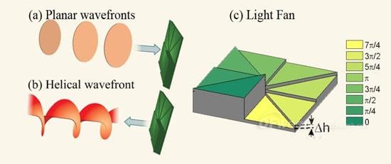 相對(duì)論的平面激光脈沖與“光扇”結(jié)構(gòu)固體靶相互作用,反射出相對(duì)論強(qiáng)度的渦旋激光脈沖。后者攜帶有很高的角動(dòng)量密度,而等離子體也獲得同量反向的軌道角動(dòng)量。