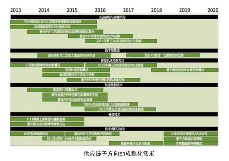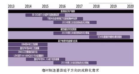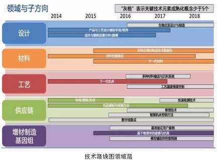 2015年9月14日,國家增材制造創(chuàng)新機(jī)構(gòu)發(fā)布了公開版的技術(shù)路線圖,勾勒了未來5年的該機(jī)構(gòu)乃至美國增材制造工業(yè)技術(shù)發(fā)展的路徑。路線圖包括設(shè)計(jì)、材料、工藝、價(jià)值鏈和增材制造基因組5個(gè)領(lǐng)域: