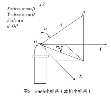 激光跟蹤儀得到的測(cè)量數(shù)據(jù)定義了一個(gè)完整的球體坐標(biāo)系。原點(diǎn)是主機(jī)反射鏡中心,根據(jù)三角函數(shù)公式可將球坐標(biāo)系下的坐標(biāo)值轉(zhuǎn)換成笛卡爾坐標(biāo)系下的坐標(biāo)值,坐標(biāo)系原點(diǎn)仍在反射鏡中心,稱作base或本機(jī)坐標(biāo)系,被固化在硬盤中,不能被執(zhí)行刪除、更名等操作。base坐標(biāo)系也是開(kāi)始一個(gè)新工作的起始坐標(biāo)系,如圖3所示。