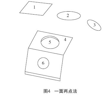 一面兩點(diǎn)法即用一個(gè)平面和兩個(gè)點(diǎn)創(chuàng)建一個(gè)坐標(biāo)系。實(shí)際點(diǎn)和理論點(diǎn)可以是:點(diǎn)、圓、球、方、圓環(huán)或橢圓元素。為計(jì)算坐標(biāo)系,第一個(gè)點(diǎn)和第二個(gè)點(diǎn)不能是一個(gè)點(diǎn),也不能在垂直于平面的一條直線上。如圖4所示,面1為理論平面,點(diǎn)2和點(diǎn)3為理論點(diǎn),面4為實(shí)際平面,點(diǎn)5和點(diǎn)6為實(shí)際點(diǎn)。其原理是調(diào)節(jié)每一個(gè)元素的理論值達(dá)到測(cè)量值,面將固定2個(gè)旋轉(zhuǎn)自由度和一個(gè)平移自由度,第一個(gè)點(diǎn)固定2個(gè)平移自由度,第二個(gè)點(diǎn)固定一個(gè)旋轉(zhuǎn)自由度。