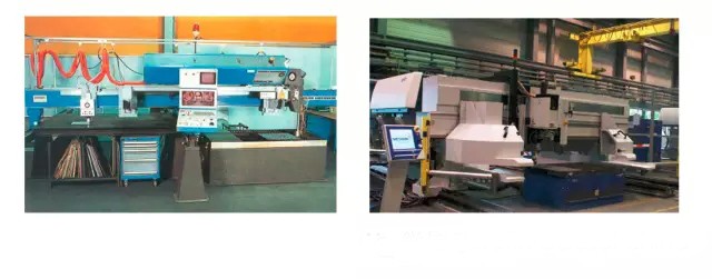 圖4:七十年代初期的Messer切割系統(tǒng):激光源傾斜45°。這使得用戶通過(guò)使用一個(gè)相移延遲90°的光束彎曲裝置,在工件上獲得圓偏振光(左圖)。2014年的Messer切割系統(tǒng):配備4.5 kW CO2板條激光器的大型系統(tǒng)。所有Rofin的CO2激光器發(fā)射與水平面成45°的偏振光束(右圖)。