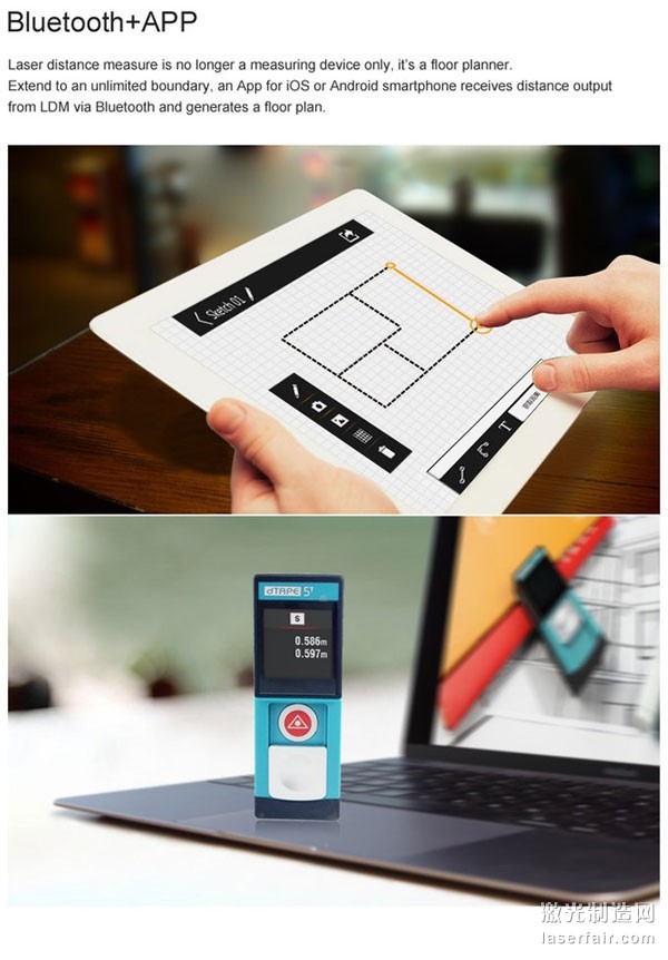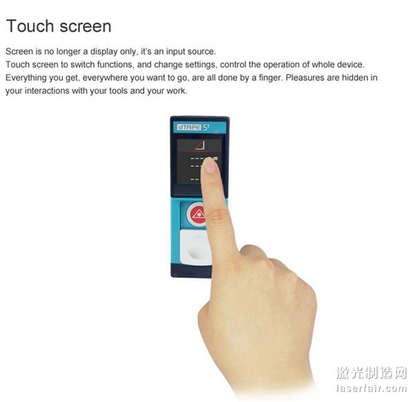 dTape 5T不只是一款普通的數碼尺,它配備有觸摸屏,通過藍牙與手機APP相連接。屏幕不再只有顯示的功能,還能輸入數據。輕觸屏幕就能進行切換功能和調整設置等操作,用手指就能輕松完成一切。