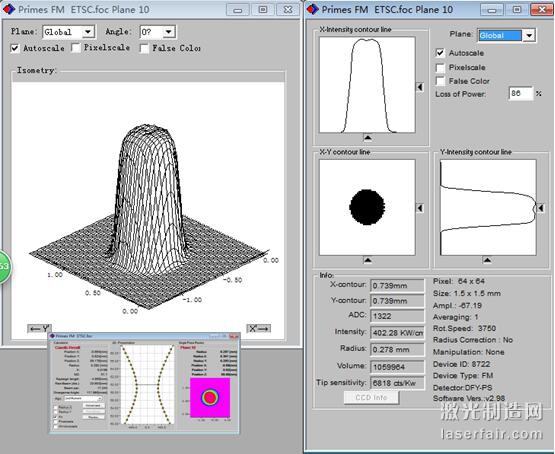 激光器為IPG 400W單模激光器,光束分析儀采用德國PRIMES公司的FocusMonitor光束品質(zhì)分析系統(tǒng)進(jìn)行測試。該模式是接近于基模TEM00的橫模光場分布,能量集中于圓形光斑中心,是激光切割首選的模式。