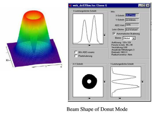 圖三是焊接用的甜甜圈狀的光場分布,用于一些特定場合。該模式是一種單環(huán)模,也叫準(zhǔn)基模。在焊接應(yīng)用中,單環(huán)模的速度和焊接質(zhì)量要明顯優(yōu)于基模。