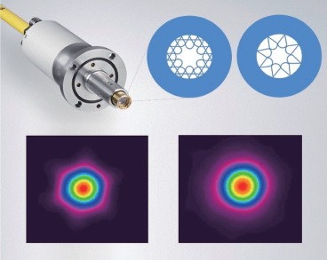 微納結(jié)構(gòu)的空芯光纖(Microstructured hollow-core fibers,簡(jiǎn)稱MHCFs,見(jiàn)圖2)支持光束在中空芯部(例如充氣或真空狀態(tài))中傳輸,這使得其能夠傳輸極高的功率并且徹底消除了非線性效應(yīng)。這種光纖從光子晶體光纖(photonic crystal fibers)演變而來(lái),最早由來(lái)自英國(guó)巴斯大學(xué)(Bath University)的Russell,Knight和Birks共同開發(fā)研制。從那之后,各種不同樣式的微納結(jié)構(gòu)光纖被開發(fā)出來(lái),并證明了其可以傳輸高功率超快激光的潛在價(jià)值。此類光纖擁有類似于單模階躍折射率光纖(step-index fibers)的芯部尺寸,而約束光線的芯部構(gòu)造像是不規(guī)則的水晶。但不同的是,其芯部長(zhǎng)度可以大大延長(zhǎng),并且承受更高的損傷閾值。99%的激光光線在其中空芯部中傳導(dǎo),可允許的脈沖能量等級(jí)提高到了毫焦耳(mJ)級(jí)別,大大超過(guò)了許多材料加工所需的能量等級(jí)。