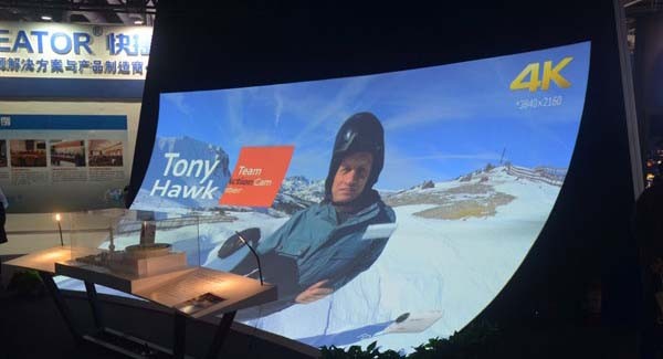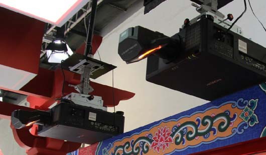 日立的影壁投影展示區(qū)采用1DLP高亮度激光工程機(jī)(TCP-BL7500U)2臺(tái)及超短鏡頭(FL-920)背投,結(jié)合邊緣融合技術(shù),給參觀者中國(guó)風(fēng)的體驗(yàn)。這個(gè)顯示系統(tǒng)簡(jiǎn)單,特別適用于空間狹小,投射距離有限的展示區(qū)域。此類的方案非常之多,在新光源的條件下,方案形式更多樣化,曲面、融合、異形,球面等形式成為了可能。