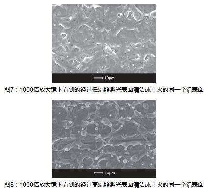 眾所周知,鋁材表面有比較厚的天然氧化層,這對(duì)大多數(shù)焊接加工來(lái)說(shuō)都是不利的,清除這些涂層能有效改善粘結(jié)性能和焊接質(zhì)量。圖6所示為在高倍放大鏡下看到的未經(jīng)研磨拋光處理的1100鋁合金表面。不難理解,表面的不均勻性會(huì)導(dǎo)致材料厚度和天然氧化層的狀況出現(xiàn)較大差異,進(jìn)而造成表面屬性的重復(fù)性較差。由于交通運(yùn)輸業(yè)對(duì)輕量化的需求,人們對(duì)鋁合金材料的關(guān)注度日益提高,為此,我們也進(jìn)行了相關(guān)實(shí)驗(yàn),以評(píng)估這種高功率光纖激光器在一系列鋁材表面織構(gòu)應(yīng)用中的加工性能。