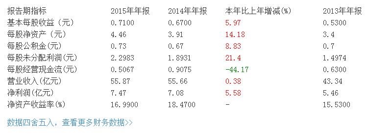 2015年度營業(yè)收入558,734.47萬元,營業(yè)利潤61,442.31萬元,歸屬于母公司的凈利潤74,695.15萬元,扣除非經(jīng)常性損益后凈利潤67,052.79萬元,分別較上年度增減幅度為0.39%、-7.45%、5.57%、4.57%。