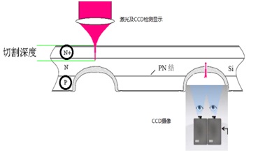 CCD通過鏤空的透明的工作旋轉(zhuǎn)臺,由下至上拍攝P面溝道獲取信息,進(jìn)行數(shù)據(jù)分析自動進(jìn)行角度、坐標(biāo)位置補(bǔ)償,從而實(shí)現(xiàn)自動切割。