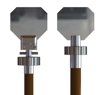 傳統(tǒng)的振鏡具有一個直徑比磁鐵小得多的輸出軸。制造商常常在這個非常小的軸上鉆一個孔,在其中放置一個“停止銷”(stoppingpin)來限制電機的旋轉(zhuǎn)量。不幸的是,這意味著,這個軸必須做得更長以容納停止銷,這個用來容納停止銷的孔會削弱軸的強度。然后一個獨立的鏡座被用來作為軸和鏡子之間的界面,從而增加了磁鐵和鏡子之間的距離。
