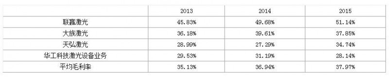 由于在自動化焊接解決方案方面核心優(yōu)勢技突出,聯(lián)贏激光的毛利率一直保持在行業(yè)平均水平之上,并且呈上升態(tài)勢,公司2013年-2015年的毛利率分別為45.83%、49.68%和51.14%,大幅高于行業(yè)平均水平。