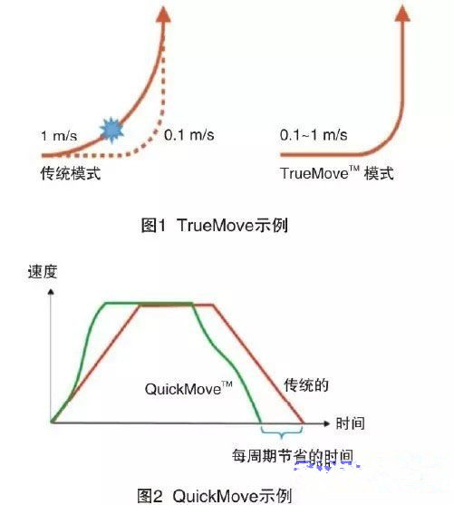 如圖2所示,傳統(tǒng)機(jī)器人在速度上升和下降的過程中加速度保持不變,相應(yīng)的完成一個動作節(jié)拍的時間也較長。基于高級動力模型控制技術(shù)的QuickMove可以精確控制機(jī)器人的加減速度和穩(wěn)定速度,通過使機(jī)器人任意時刻的加速度最大化來減少動作節(jié)拍時間。