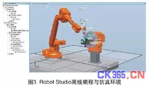 RobotStudio是ABB開發(fā)的離線編程與仿真軟件,可在電腦上完成幾乎所有的機(jī)器人編程與仿真。如圖3所示,通過RobotStudio能夠?qū)崿F(xiàn)十分逼真的模擬,并且所用的均為實際使用的機(jī)器人程序和配置文件。配合ABBAbsoluteAccuracy校正系統(tǒng),可以使模擬結(jié)果達(dá)到很高的精度。RobotStudio還可方便地導(dǎo)入IGES、STEP、CATIA等主流CAD格式數(shù)據(jù),然后依據(jù)這些精確的數(shù)據(jù)編制機(jī)器人程序。使用軟件中的AutoPath功能,僅在數(shù)分鐘之內(nèi)便可自動生成跟蹤加工曲線所需要的機(jī)器人位置(路徑),很好地解決了激光切割中復(fù)雜切割曲線無法通過示教產(chǎn)生的問題,大大節(jié)約了編程時間。