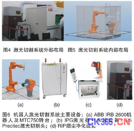 機(jī)器人激光切割系統(tǒng)外部布局和內(nèi)部布局分別如圖4和圖5所示。整個系統(tǒng)主要由ABBIRB2600機(jī)器人及MTC750轉(zhuǎn)臺(圖6a)、IPG激光器及水冷設(shè)備(圖6b)、Precitec激光切割頭(圖6c)、RIP煙塵凈化設(shè)備組成(圖6d)。