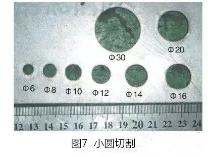 3)高質(zhì)量的激光切割效果除了要求機(jī)器人自身應(yīng)具有很高的運動軌跡精度外,良好的切割工藝也是必備因素。切割工藝涉及到切割速度和加速度、激光功率、焦點位置、吹氣量等多種因素的綜合調(diào)節(jié)。圖7為工藝調(diào)整后切割出的小圓,直徑分別為Φ6,Φ8,Φ10,Φ12,Φ14,Φ16,Φ20,Φ30,可以看出切割后的小圓熱變形很小,邊緣光潔,無明顯缺陷。經(jīng)測量,小圓的軌跡誤差約為0.1~0.25mm,說明基于ABB機(jī)器人的激光切割系統(tǒng)具有很高的運動精度和切割精度。