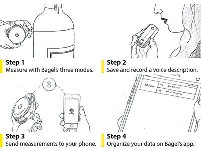 一邊測量一邊找紙和筆記錄,豈不麻煩。別擔(dān)心,Bagel是一款能聽你說話的卷尺。擔(dān)當(dāng)測量完畢時,按下存儲鍵,即可錄下一段語音描述,比如“床的寬度”,Bagel就會通過藍牙將語音傳輸至手機App上,手機自動將語音轉(zhuǎn)換成文字,你的每次測量時間、測量結(jié)果、測量模式和語音轉(zhuǎn)換文字的備忘錄就都能永久地存儲在手機中,并分享給朋友們。