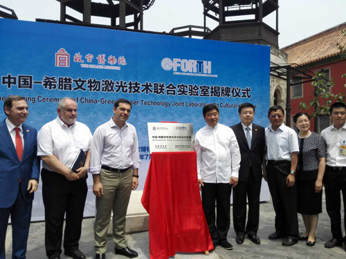 2016年7月5日,中國科學技術交流中心孫洪主任應故宮博物院和希臘研究技術基金會邀請,同來訪的希臘總理阿萊克西斯·齊普拉斯一行,在故宮博物院共同見證了中國- 希臘文物激光技術聯(lián)合實驗室揭牌啟動。