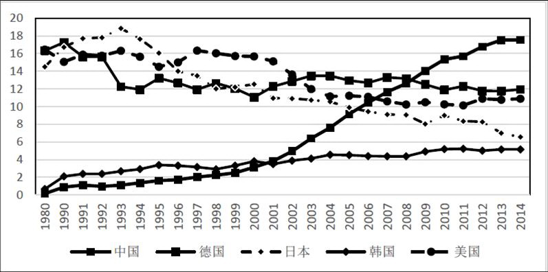 1980-2014年主要國家裝備制造業(yè)出口規(guī)模。資料來源:機(jī)械工業(yè)信息研究院
