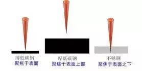 那么,什么叫焦點(diǎn)控制呢?熟悉激光切割機(jī)的朋友都知道,激光切割機(jī)在切割不同材料以及不同厚度的板材時(shí),為了達(dá)到更好的切割效果,激光束的焦點(diǎn)都會(huì)設(shè)置在不同的地方(如圖),即稱為我們所說的調(diào)焦。