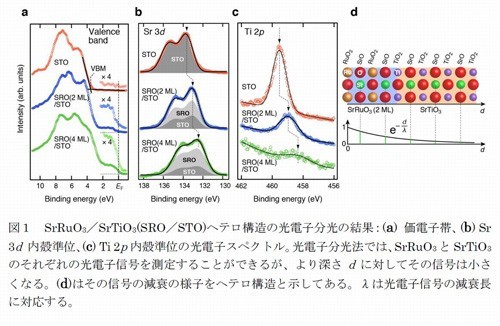 利用兵庫縣的大型同步輻射設施“SPring-8”的高亮度軟X射線束,測量光電子能譜(對金屬和半導體照射光,根據(jù)釋放的電子能量得知固體表面電子結構的實驗方法)發(fā)現(xiàn),因SrRuO3的膜厚不同,SrRuO3膜的電子狀態(tài)會由半導體變?yōu)榻饘?,隨之,SrTiO3基板的載流子電子密度會由高變低。