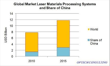 中國市場的快速增長令人印象深刻。2005年,中國的激光材料加工系統(tǒng)成交量僅為3億美元,占全球市場的5%。2011年,國內市場增長到18億美元。市場規(guī)模的增長交替進行, 2012年增幅為10%, 2014年猛增了30%, 2015年則上升10%。