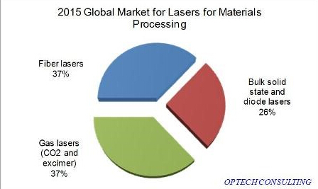 2015年,光纖激光器占全球激光材料加工37%的市場份額(32億美元);另外,氣體激光器占37%,大容量固體、半導體激光器占據(jù)26%。產(chǎn)品在過去10年所占市場份額大幅增加,從2005年的4%增長到2010年的14%,直到2015年的37%。過去五年光纖激光器材料加工市場的平均年增長率始終接近30%。