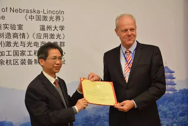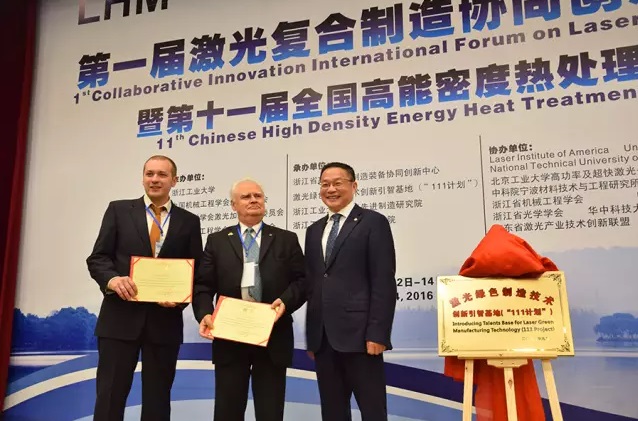 梅新林在致辭中代表浙江工業(yè)大學(xué)對(duì)會(huì)議的召開(kāi)表示衷心的祝賀,向蒞臨本次大會(huì)的各位領(lǐng)導(dǎo)、專家和企業(yè)家們表示衷心的感謝,他還向與會(huì)代表介紹了我校近年來(lái)的發(fā)展情況和教學(xué)、科研、社會(huì)服務(wù)方面取得的各項(xiàng)成果。之后,梅新林書(shū)記與厲勇局長(zhǎng)共同為浙江工業(yè)大學(xué)“激光綠色制造技術(shù)創(chuàng)新引智基地”(簡(jiǎn)稱“111計(jì)劃”)揭牌,并為英國(guó)皇家工程院院士、美國(guó)激光學(xué)會(huì)主席Lin Li教授,烏克蘭國(guó)家工程院院士、烏克蘭國(guó)立科技大學(xué)Volodymyr Kovalenko教授,美國(guó)內(nèi)布拉斯加林肯大學(xué)Yongfeng Lu教授,美國(guó)BOS光子公司Bo Gu研究員等頒發(fā)了激光綠色制造技術(shù)創(chuàng)新引智基地海外特聘專家聘書(shū)。