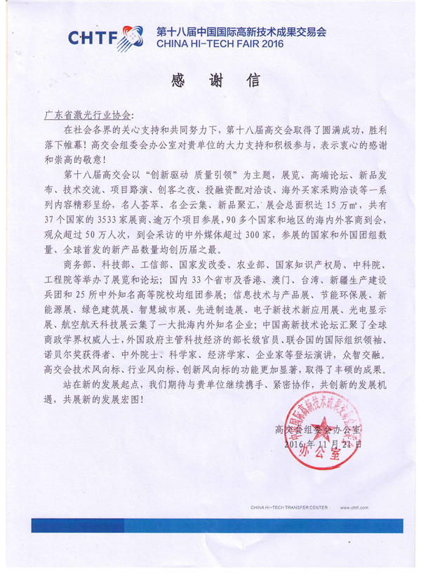 在剛剛結(jié)束的高交會(huì)上,廣東省激光行業(yè)協(xié)會(huì)榮譽(yù)收到中國(guó)國(guó)際高新技術(shù)成果交易會(huì)組委會(huì)頒發(fā)的“優(yōu)秀組織獎(jiǎng)”并附感謝信,感謝信說(shuō):“在社會(huì)各界的關(guān)心支持和共同努力下,十八屆中國(guó)國(guó)際高新技術(shù)成果交易會(huì)取得了圓滿成功,勝利落下帷幕。高交會(huì)組委會(huì)辦室對(duì)貴單位的大力支持和積極參與,表示衷心感謝和崇高的敬意”! “并期待與貴單位繼續(xù)攜手,緊密協(xié)作,共創(chuàng)新的發(fā)展機(jī)遇,共展新的發(fā)展宏圖”。