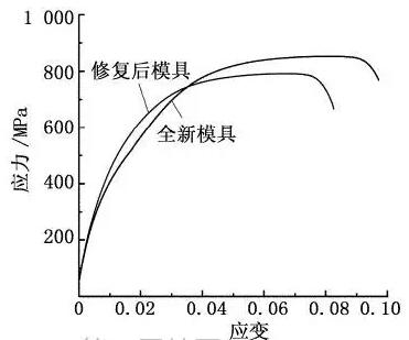 圖3為常溫下修復(fù)后模具與全新模具的拉伸應(yīng)力-應(yīng)變曲線??梢钥闯?,拉伸試樣的變形隨著拉伸應(yīng)力的增加而增加,但并不成線性關(guān)系;當拉伸應(yīng)力在690MPa以下時,A-MAX鋼的應(yīng)變較為明顯,當拉伸應(yīng)力在750MPa以上變化時拉伸應(yīng)力與應(yīng)變呈近似線性關(guān)系。