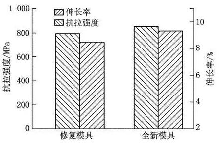 圖4為修復(fù)模具與全新模具的抗拉強度與伸長率的對比結(jié)果。其中,全新A-MAX模具的抗拉強 度為843MPa,伸長率為9.419%;修復(fù)后A-MAX模具的抗拉強度為792MPa,伸長率為8.375%,修復(fù)后模具的抗拉強度達到全新A-MAX模具的93.95%,伸長率也達到了全新模具的88.92%。由此可以看出,經(jīng)過激光熔焊修復(fù)后熱作模具的焊接接頭的抗拉強度和伸長率都非常接近全新的A-MAX模具,具有較佳的力學(xué)性能。導(dǎo)致模具修復(fù)處的焊縫強度接近A-MAX鋼母材的原因在于,模具修復(fù)處是激光熔焊中能量與溫度最高的區(qū)域,導(dǎo)致該焊縫區(qū)域在熔深方向上的焊接溫度均大于鋼的Ac3線溫度,并且A-MAX鋼調(diào)質(zhì)態(tài)的成分呈較為均勻分布。這樣在較高溫度條件下碳和其他合金元素可充分擴散,容易獲得組織成分均勻的奧氏體組織結(jié)構(gòu)。加之激光熔焊速率較快,隨后焊縫區(qū)熔融金屬會以較快速率急速冷卻下來,最終形成規(guī)則排列的貧碳細板條馬氏體和少量殘余鐵素體組織,且經(jīng)激光熔焊后,焊接接頭獲得的板條狀馬氏體組織更為細密。