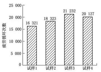 圖5是在QBG-25型高頻疲勞試驗機測試的兩種試樣的疲勞試驗結(jié)果。其中試樣1與試樣2為修復(fù)后模具的疲勞試樣,試樣3與試樣4為全新模具的疲勞試樣??梢钥闯觯嚇?的疲勞循環(huán)次數(shù)最大,取兩次測試的均值為20619次;修復(fù)后A-MAX模具的 試樣1與試樣2的疲勞循環(huán)次數(shù)均值為17322次,約為全新模具的83.69%。由此可以看出,對即將報廢的模具采用激光修復(fù)焊接后其高頻疲勞壽命得到提高,接近全新A-MAX模具,并與全新模具的疲勞循環(huán)次數(shù)已經(jīng)在同一個數(shù)量級。