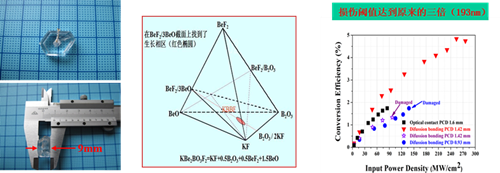 在KBBF晶體和器件研制方面,理化所突破了大尺寸KBBF晶體穩(wěn)定生長(zhǎng)技術(shù),并通過研究晶體生長(zhǎng)相區(qū),提高了產(chǎn)品成品率;發(fā)明了棱鏡耦合倍頻技術(shù),形成了器件的穩(wěn)定加工工藝,并將損傷閾值大幅度提高。