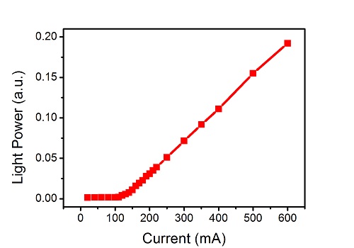 趙德剛研究員帶領(lǐng)的團隊長期致力于GaN基光電子材料和器件研究,對材料生長機理、材料物理和器件物理有自己的理解和認識,發(fā)現(xiàn)和解決了一系列激光器的關(guān)鍵問題:掌握了InGaN量子阱局域態(tài)調(diào)控和缺陷抑制方法,提高了發(fā)光效率;闡明了碳雜質(zhì)的補償機制,獲得了高質(zhì)量的p-GaN材料;設(shè)計出優(yōu)化的器件結(jié)構(gòu),減小了吸收損耗和電子泄漏;利用變程跳躍的物理機制,實現(xiàn)了良好的p-GaN歐姆接觸;解決了同質(zhì)外延中襯底翹曲的難題,采用MOCVD生長出高質(zhì)量的器件結(jié)構(gòu)。在此基礎(chǔ)上,與中科院蘇州納米所進行工藝合作,最終實現(xiàn)了GaN紫外激光器的室溫電注入激射。條寬為10 μm、腔長為600 μm的激光器閾值電流密度為1.6-2.0 kA/cm2,激射波長為392-395 nm,連續(xù)激射輸出光功率可達80 mW。圖1為紫外激光器的激射光譜,圖2為P-I曲線,圖3為紫外激光器激射時照到復印紙上形成的藍色熒光光斑(紫外光人眼看不見,紫外激光照到復印紙上會發(fā)出藍色熒光)。