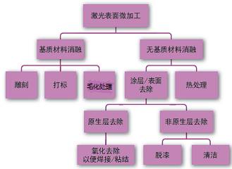 雖然這些技術(shù)通常被稱為激光表面處理,從機械角度來看,這些工藝與激光打標息息相關(guān),因為它們局限于對部件的表面處理,通常需要結(jié)合采用激光消融與熔融工藝。圖1嘗試著用行業(yè)廣為接受的術(shù)語以及所涉及的主要物理機制,來對這種范圍廣泛的工藝進行分類。